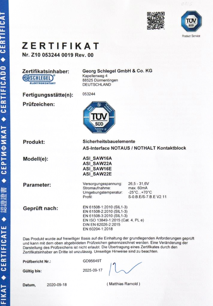 A safety certificate is essential for products that require a high level of safety, e.g. in the machine building, the railway market or in medical technology. It confirms that the product has been developed and tested in accordance with international standards for functional safety in order to mnimise risks and ensure the safety of people and the environment. SCHLEGEL also has safety certificates in the field of functional safety.