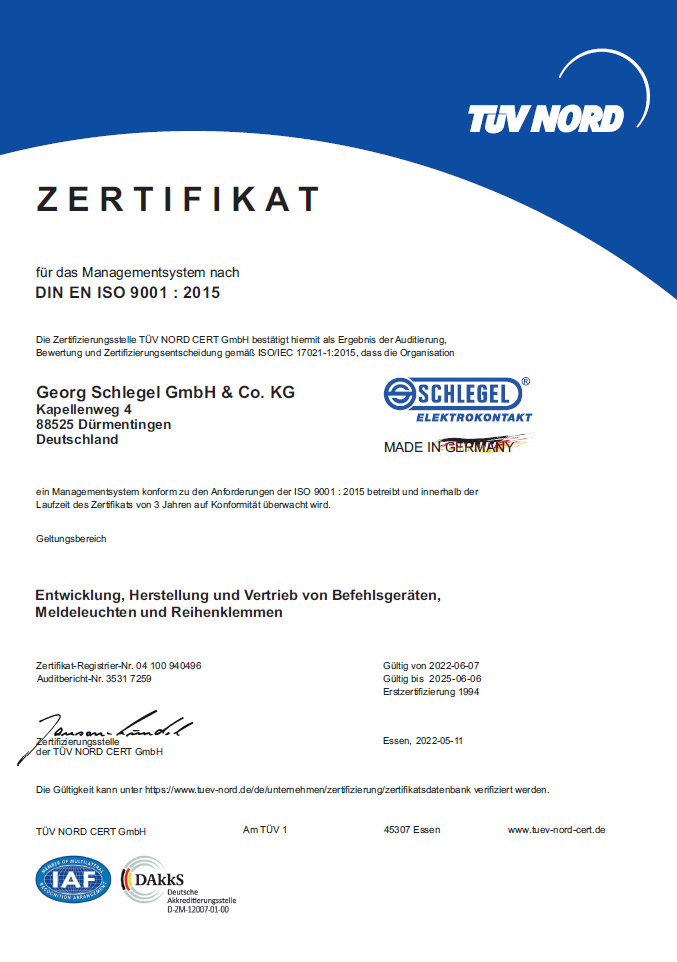 Tested and approved to be good: The continuous improvement and optimisation of internal processes and procedures are an integral part of the business activities at SCHLEGEL. SCHLEGEL has been certified according to the ISO 9001 standard since 1994 and thus meets the requirements of this quality management system. The implementation and effectiveness of the specifications are checked in regular audits. True to the SCHLEGEL motto: "If you stop trying to improve, one day you will stop being good." (Philipp Rosenthal)