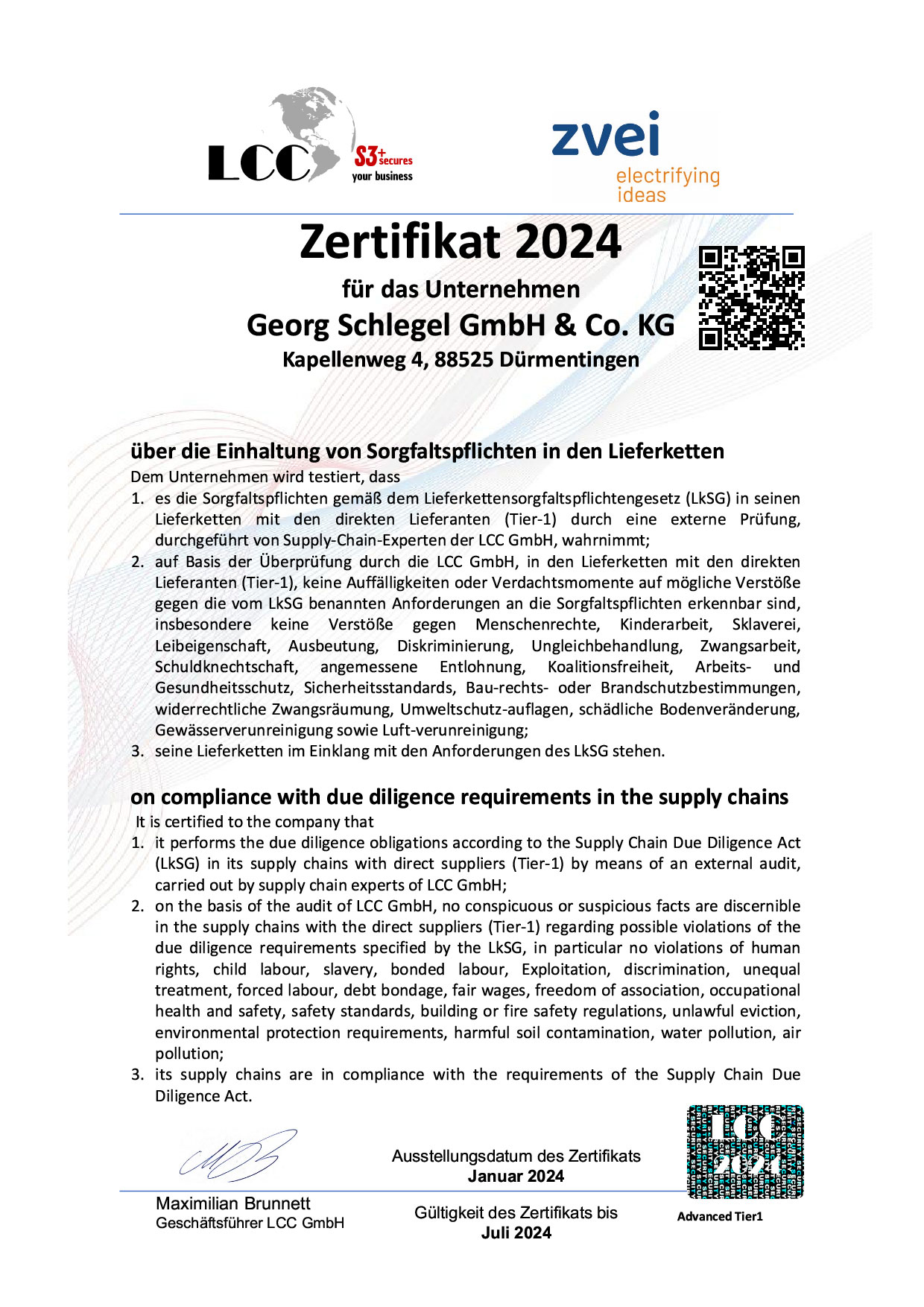 The Supply Chain Due Diligence Act (LkSG) holds companies responsible for complying with human rights in global supply chains. SCHLEGEL's supplier companies are therefore checked by an external institute for compliance regarding the requirements of the law. SCHLEGEL thus fulfils its duty of care and ensures that the supply chains are in line with the requirements of the LkSG.