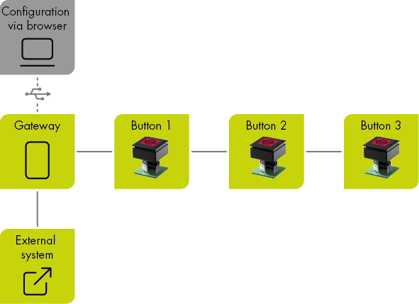 All types of Flexitast buttons can be configured via web browser. To do this, the individual button or the gateway of the Flexitast system is connected to a web-enabled device via USB cable and uploaded into the frontend. Once the connection to the Flexitast or gateway is established, the individual button or the system can be configured.